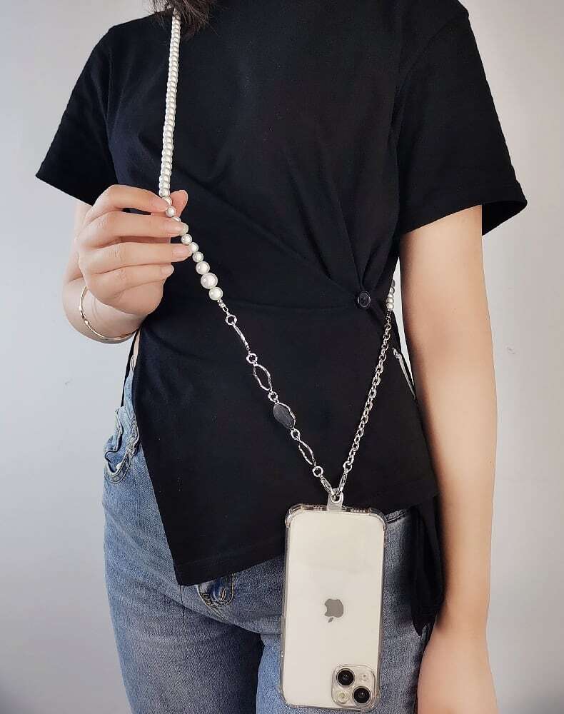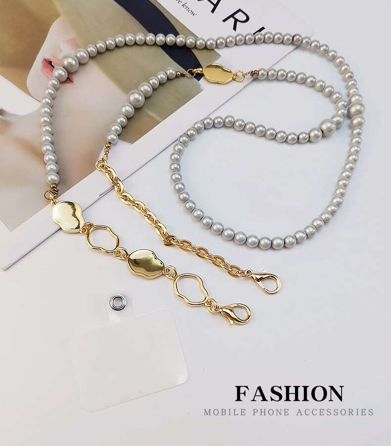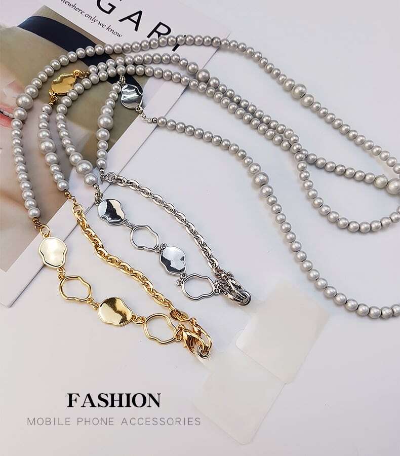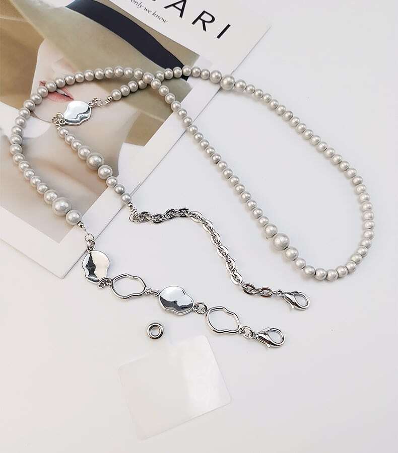 a928《シルバーチェーン》スマホショルダーストラップ レディース クリアホルダー付き フェイクパールストラップ スマホポーチ ラグジュアリー