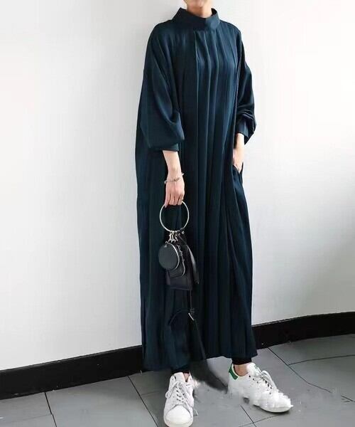 a919 ロングワンピース ブラック レディース プリーツ マキシ 長袖 体型カバー
