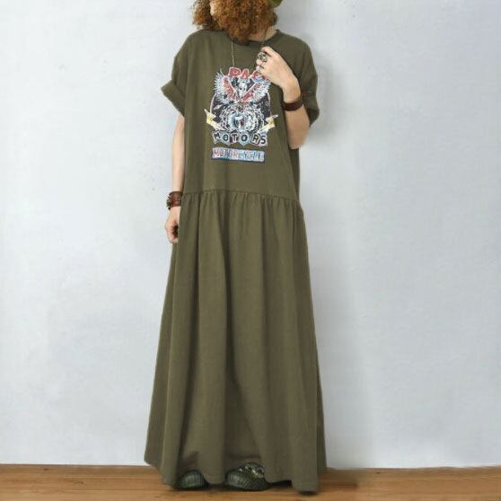 a905 (ダークグリーン)レトロ ビッグロゴ マキシ丈 ワンピース バックロゴ ロングワンピース