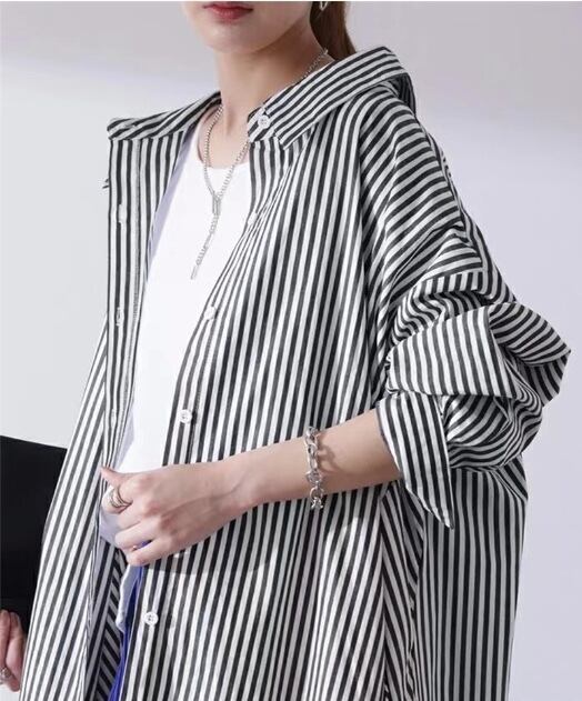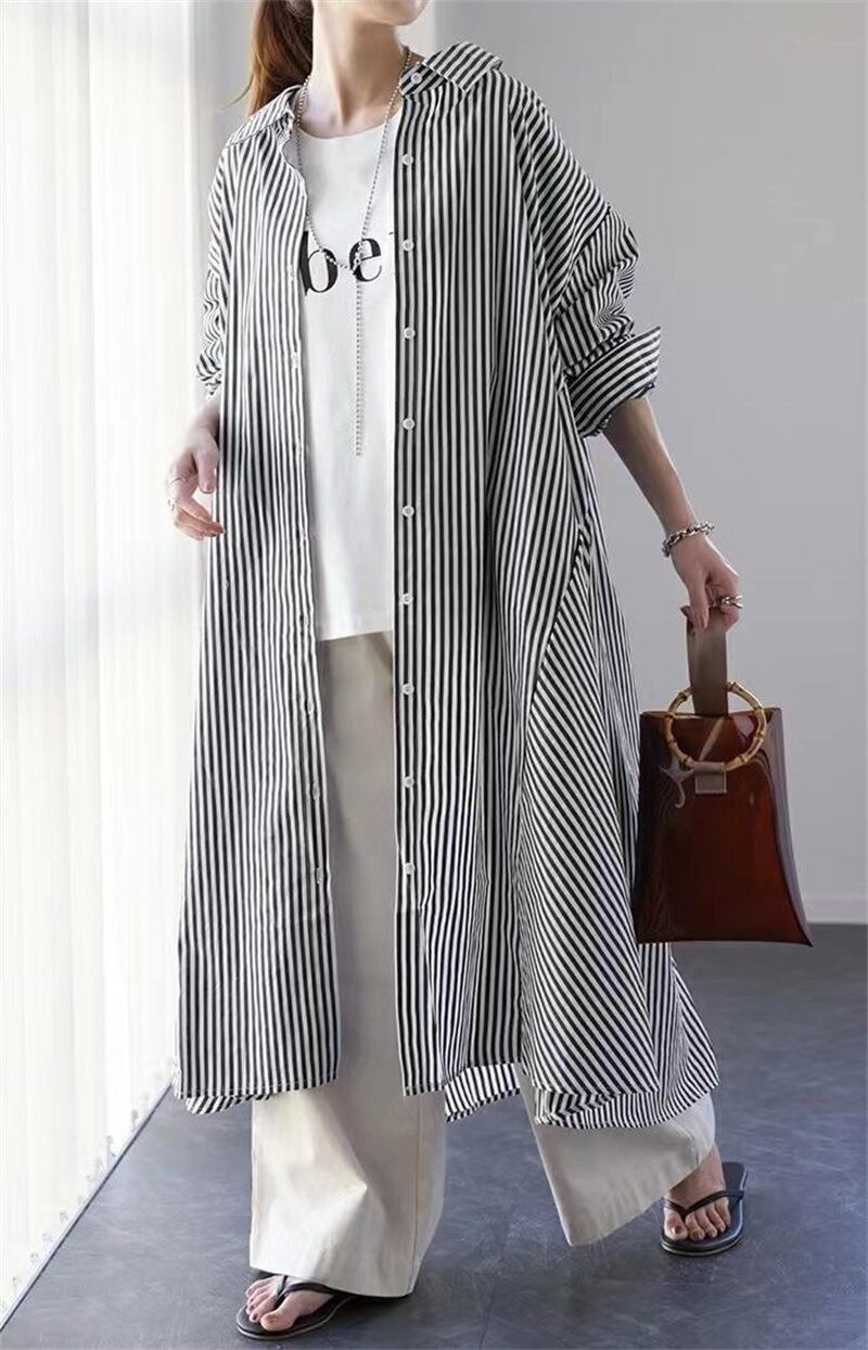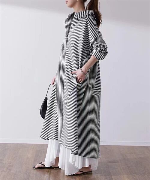 a890 こなれシャツワンピース ストライプ フレアデザイン 抜き襟